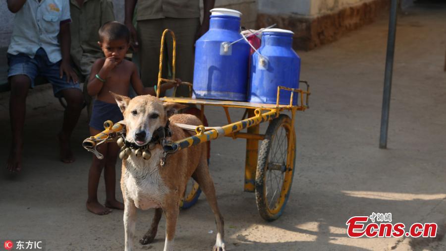 Mani, an eight-year-old Indian mutt, has been dutifully delivering 25 liters of milk cans carrying on his back, twice a day, to a milk society for last six years. The brown mongrel was trained by Thangavelu, a dairy-trader from Krishnagiri in Tamil Nadu in southern India, two years after he rescued the dog from a street a week after its birth. Thangavelu designed a special cart and built it using light-weight pipes and bicycle tyres. (Photo/IC)