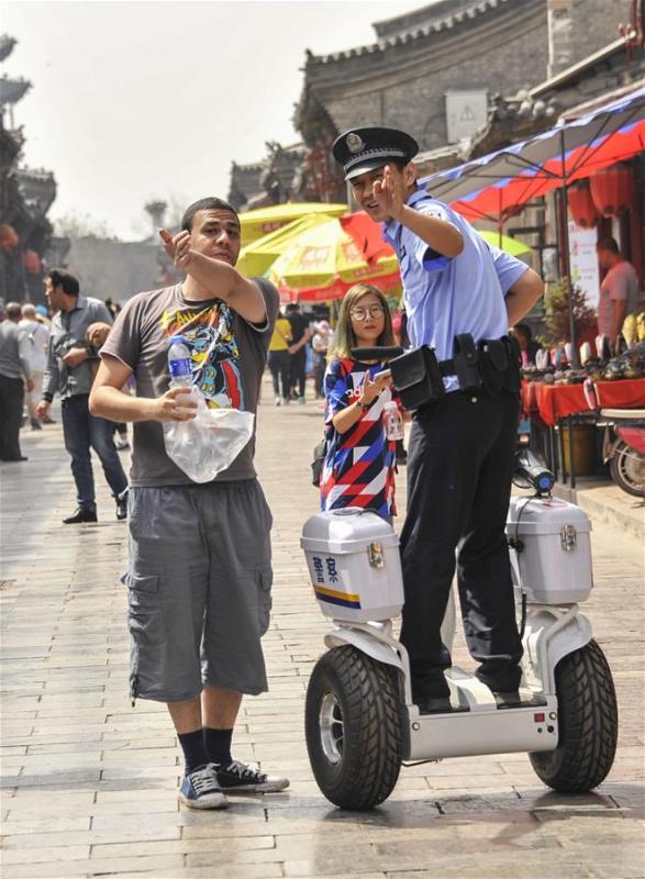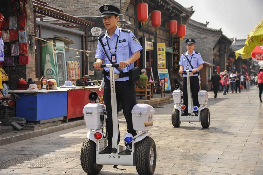 Two police officers ride Segway-like self-balancing scooters as they patrol a street in the Pingyao Ancient City, a popular tourist destination, in Jinzhong, north China's Shanxi Province, May 13, 2018. (Xinhua/Liang Shengren)