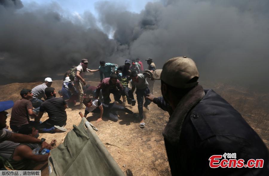 Israeli security forces intervene Palestinians during a protest organized to mark 70th anniversary of Nakba, also known as Day of the Catastrophe in 1948, and against United States' plans to relocate the U.S. Embassy from Tel Aviv to Jerusalem, in Bethlehem, West Bank, May 14, 2018. The Palestinian death toll from Israeli live fire in protests along the Gaza-Israel border on Monday rose to 52, a Palestinian health ministry official said. (Photo/Agencies)