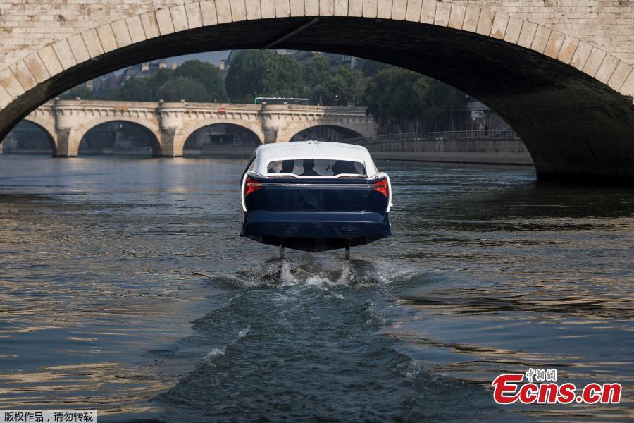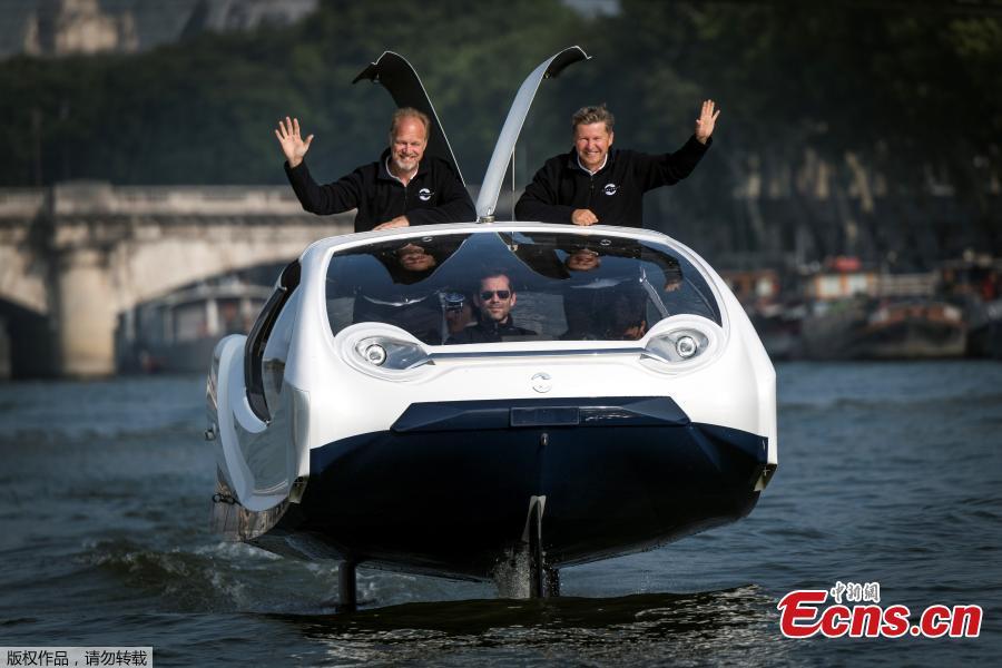 Sea Bubbles start-up founders Alain Thebault (L) and Anders Bringdal (R) stand on board a Sea Bubble electric maritime "flying taxi" during a demonstration on May 20, 2018 on the river Seine in Paris. (Photo/Agencies)