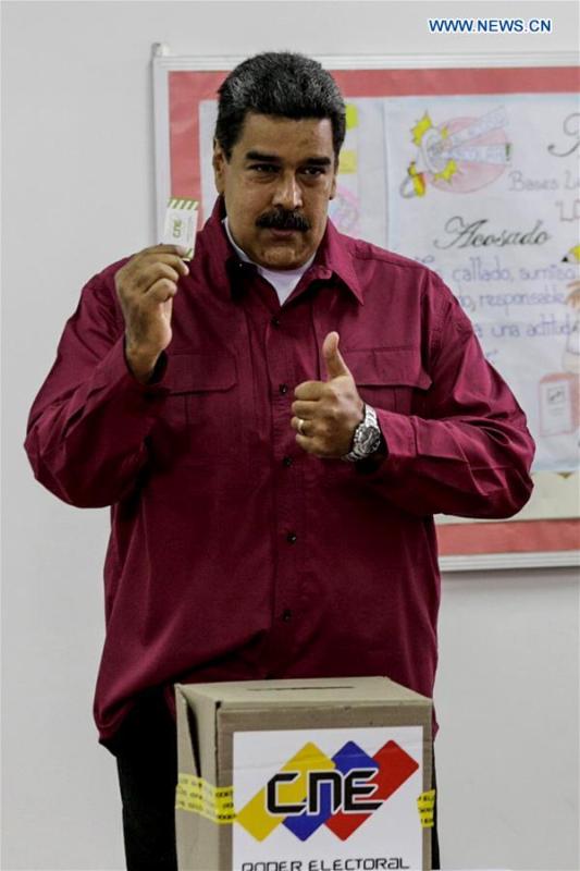 Venezuelan President Nicolas Maduro delivers a speech during a press conference after casting his vote in a polling center in Caracas, Venezuela, on May 20, 2018. Nicolas Maduro was reelected for a second six-year term in the presidential election on Sunday, according to the National Electoral Council. (Xinhua/Boris Vergara)