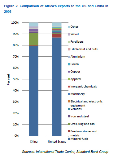 African exports to China have experienced a particularly swift advance, from less than USD1 bn in 1992 to over USD54 bn in 2008. (Africa's exports to China declined to USD43 bn in 2009.) The Chinese economy is energy intensive and in the fairly nascent stages of its own industrialisation. Nearly 80% of China's imports from Africa comprise mineral fuels and oils. Therefore, it is logical that 60% of Africa's exports to China come from the continent's oil flush states.