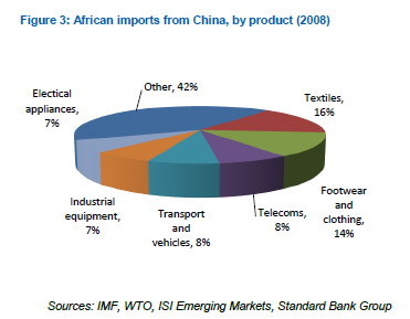 Low-cost consumer products flowing into Africa from China's coastal factories have grown rapidly in recent years. According to Trevor Manuel (2004), China's manufacturing expansion in an environment of low wages is a challenge for a host of African industries; Africa should find ways and means to engage with that reality. Electrical equipment; and nuclear reactors, boilers and machinery each account for 17% of total African imports from China. Vehicles account for 8.5% of Africa's imports from China. In fact, China provides Africa with 10.2% of its vehicle imports. Both cotton and articles of iron and steel amount to above 6% of Africa's total imports from China, respectively. In fact, 10% of Africa's cotton imports come from China. Similarly, a large proportion of artificial filament (10%), ceramic product (9%) and glassware (5%) that is imported by Africa originates from China.