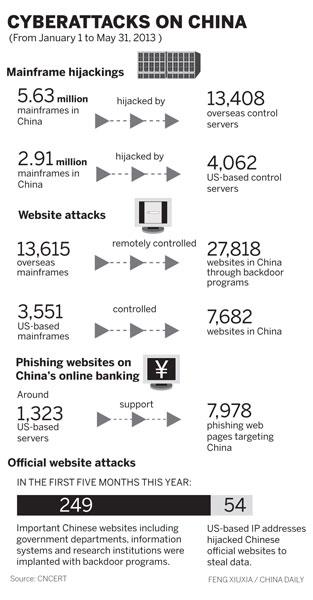 According to CNCERT, in the first five months of this year, 13,408 overseas trojan horses or bot control servers — two popular hacking tools — hijacked around 5.63 million mainframes in China. Of those, 4,062 US-based control servers hijacked 2.91 million mainframes in China.
