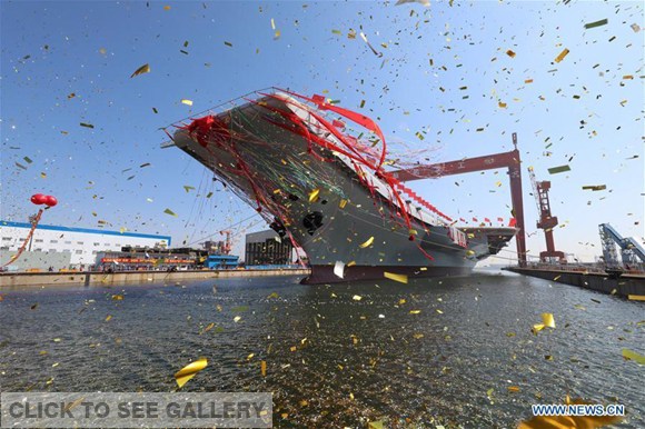 China launched its first domestically built aircraft carrier Wednesday morning at a grand ceremony, with navy officers and military supporters hailing the country's military achievement.