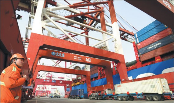 An employee oversees loading of cargo bound for the United States at Qingdao Port in Shandong province. (Photo for China Daily/Zhang Jingang)
