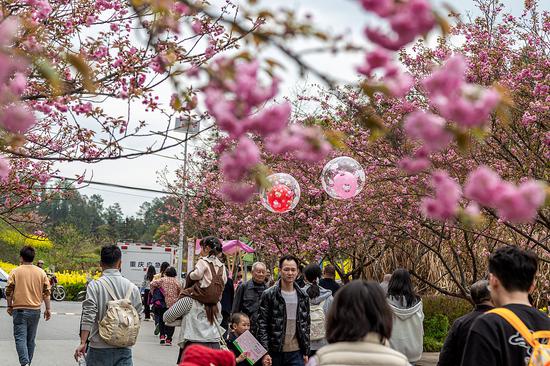 In Jinlong village, Daguan town of Nanchuan district, Chongqing, cherry blossoms have burst into full bloom, with thousands of pink blossoms creating a breathtaking scene against a backdrop of golden rapeseed fields. The stunning spring landscape is attracting throngs of visitors eager to enjoy the beauty and capture the moment of spring.