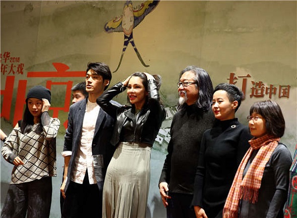 Director Lai (third from right) and the cast of Peking Man attend a promotional event in Beijing. (Photo by Zou Hong/China Daily)