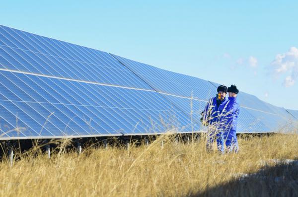 Electricians check solar panels at a photovoltaic power plant in the Inner Mongolia autonomous region. (WANG ZHENG/FOR CHINA DAILY)