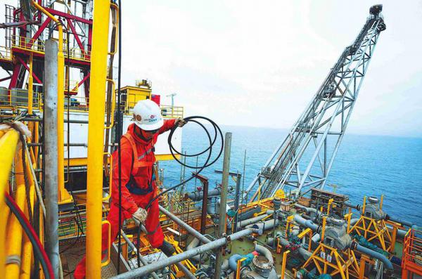 An engineer works at the Dongfang 13-2 gas fields project, China's largest offshore high-temperature and high-pressure gas fields project, located offshore near Dongfang, Hainan province. (YUAN CHEN/FOR CHINA DAILY)