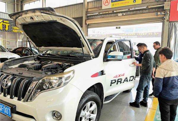 A used Toyota Prado is inspected by potential buyers in Jinhua, Zhejiang province, on March 21. (LI JIANLIN/FOR CHINA DAILY)