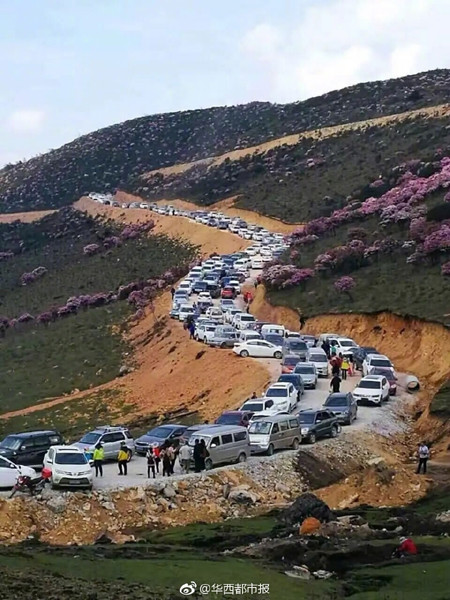 More than 2,000 tourists and 800 cars arrived at Haikou Pasture in the prefecture's Puge County to enjoy the azaleas, bringing local traffic to a halt.