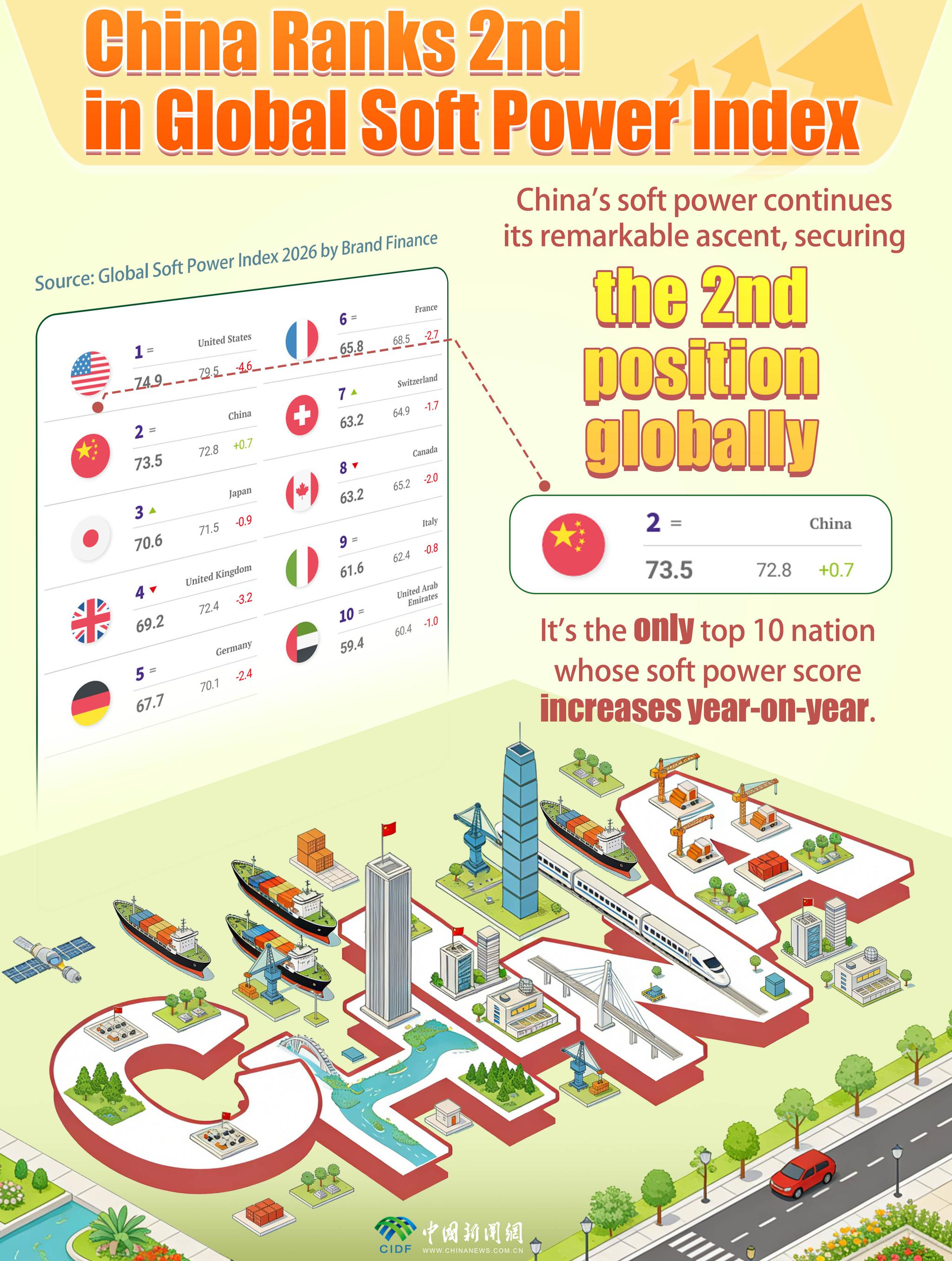The "Global Soft Power Index 2026" recently released by the British consulting firm “Brand Finance” shows that China ranks second globally in the soft power index, scoring 73.5 out of 100. Moreover, China was the only nation among the top 10 to see its score increase, ranking first globally in multiple indicators.