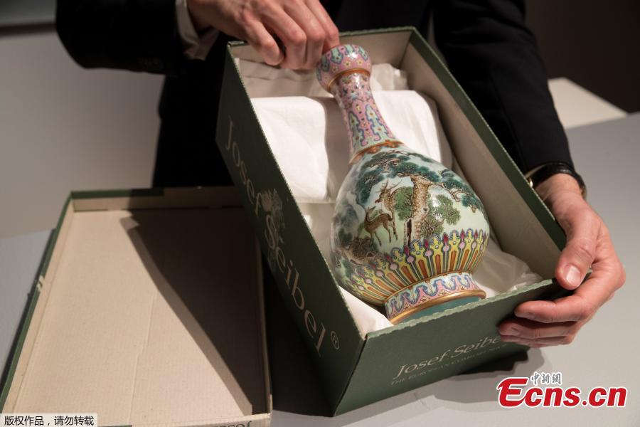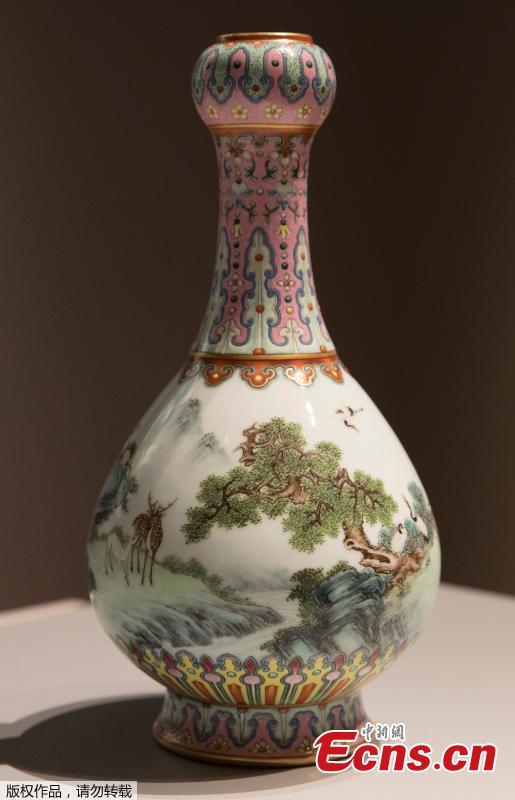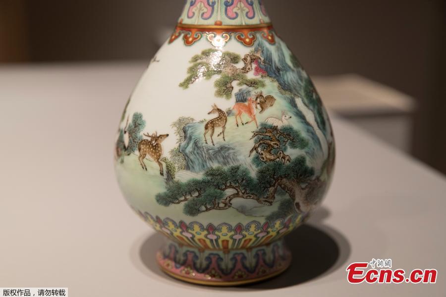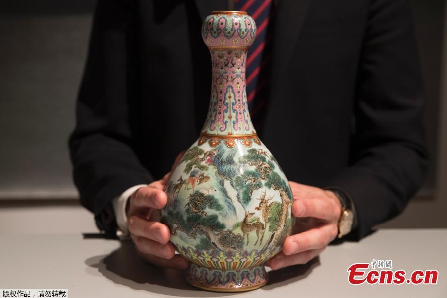 A rare Imperial Qianlong porcelain vase (18th century) is displayed at Sotheby's auction company in Paris, on May 22, 2018. The vase, which was stored in a shoebox in an attic for decades, will be sold at Sotheby's Paris on June. (Photo/Agencies)