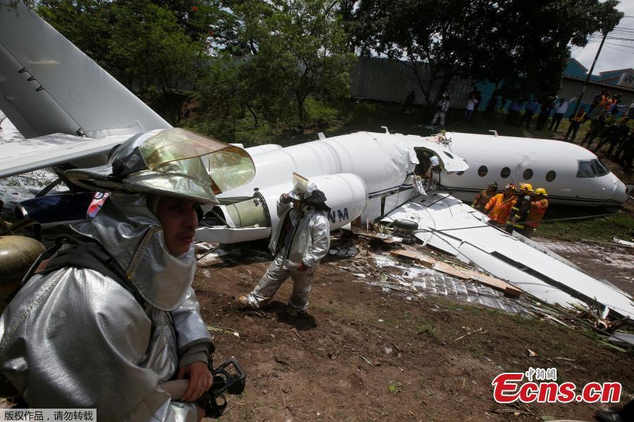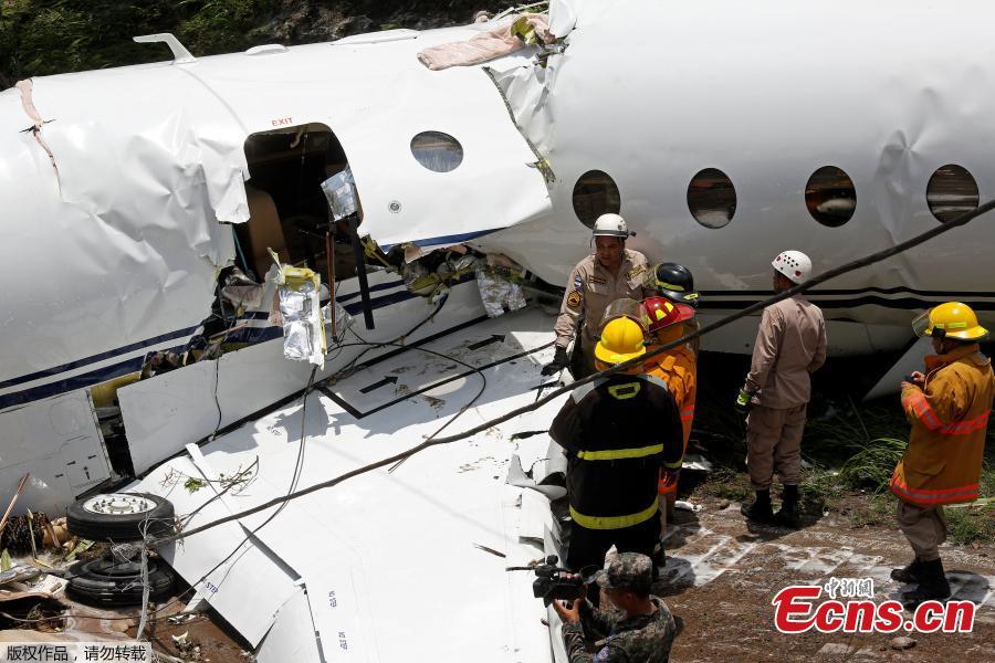 Firefighters stand near a Gulfstream G200 aircraft that skidded off the runway during landing at Toncontin International Airport in Tegucigalpa, Honduras, May 22, 2018. At least six passengers were injured. (Photo/Agencies)