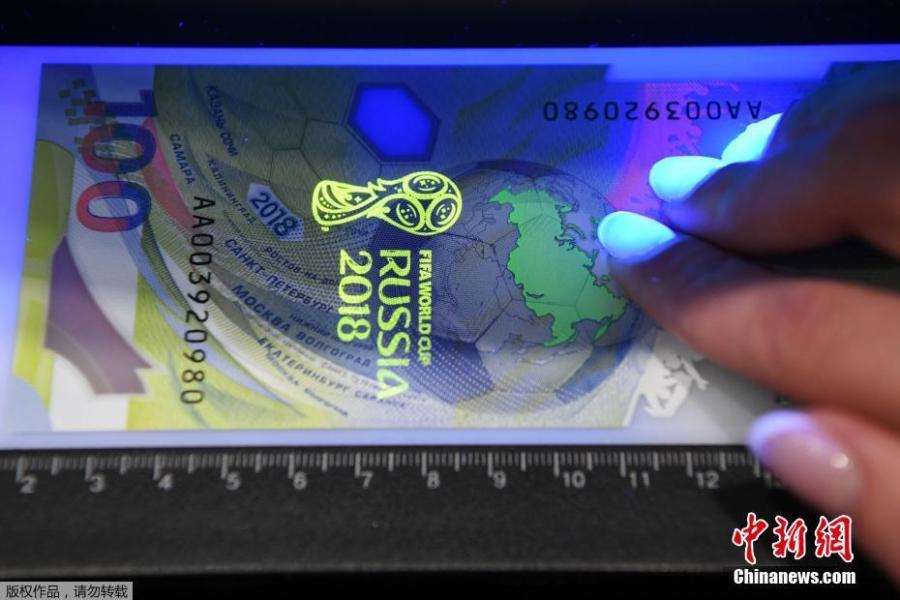 Security features of the newly designed 100-rouble banknote dedicated to the 2018 FIFA World Cup, during a news conference in Moscow, Russia, May 22, 2018. Russia’s central bank has stated that a total of 20 million commemorative bills will enter circulation. (Photo/Agencies)