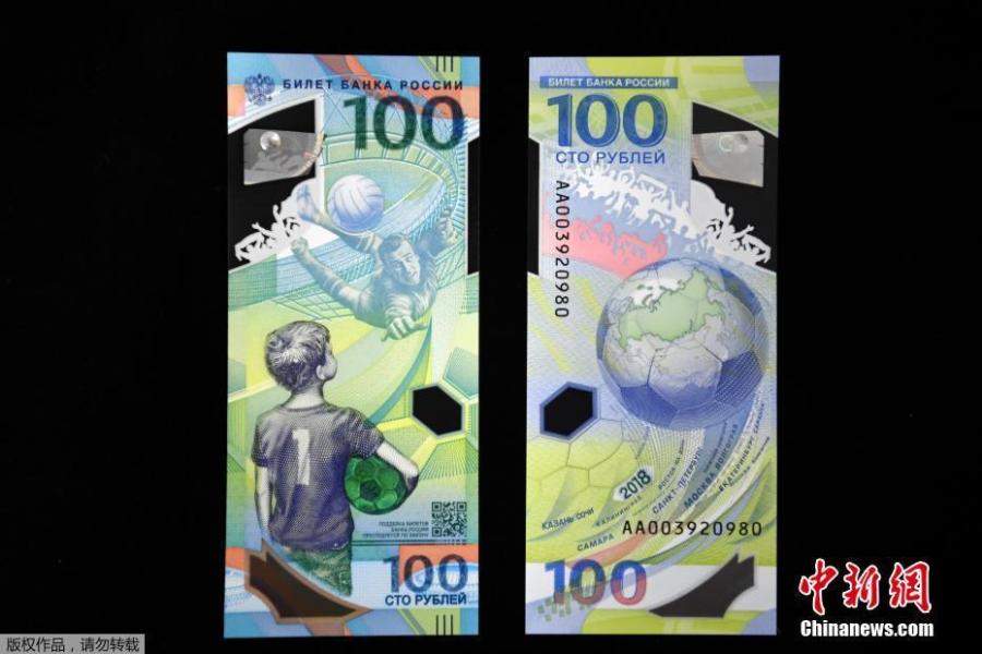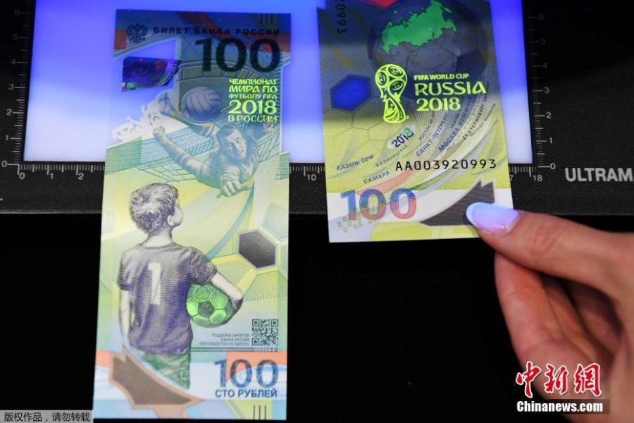 A new 100-rouble banknote issued by Russia's central bank to mark the upcoming 2018 FIFA World Cup is on display during a news conference in Moscow, Russia, May 22, 2018. Russia’s central bank has stated that a total of 20 million commemorative bills will enter circulation. (Photo/Agencies)