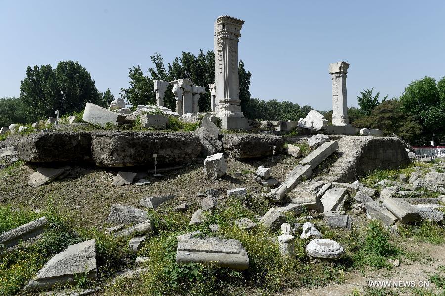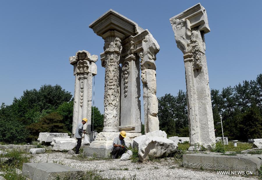 Staff members clean up weeds at ruins of Yuanying Guan (Immense Ocean Observatory) at Yuanmingyuan in Beijing, capital of China, May 23, 2018. The four-month reinforcement project of ruins of Immense Ocean Observatory at the historical site of Yuanmingyuan started lately.(Xinhua/Luo Xiaoguang)