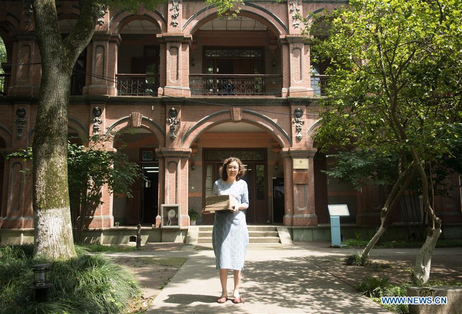 Yan Jingshu poses for photo in front of the ancient book restoration center of Zhejiang Library in Hangzhou, east China's Zhejiang Province, May 23, 2018. Yan, 55, has worked in the national level ancient book restoration center of the library for 38 years. She and her colleagues collected more than 200 types of paper to restore ancient books. (Xinhua/Weng Xinyang)