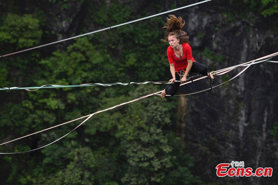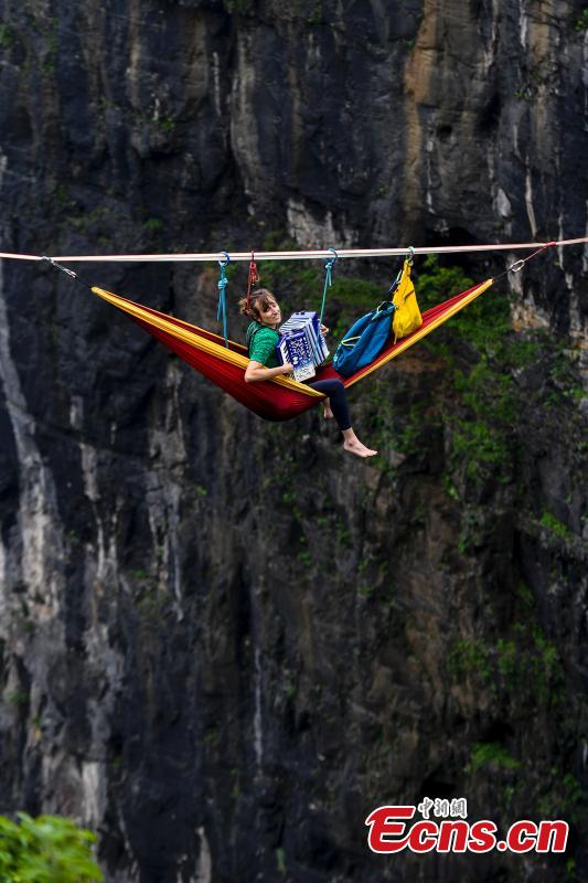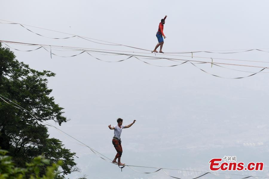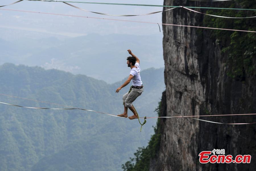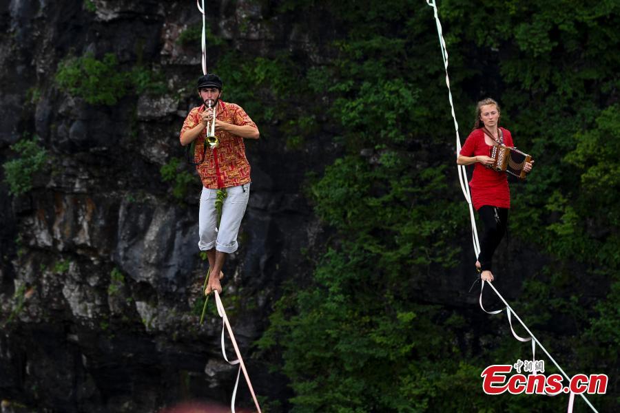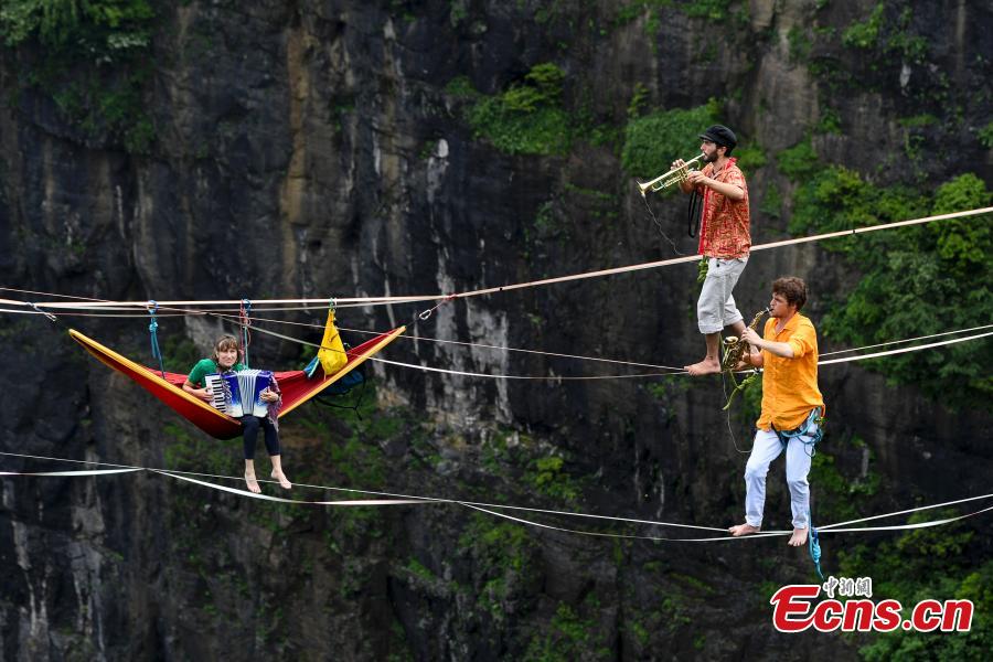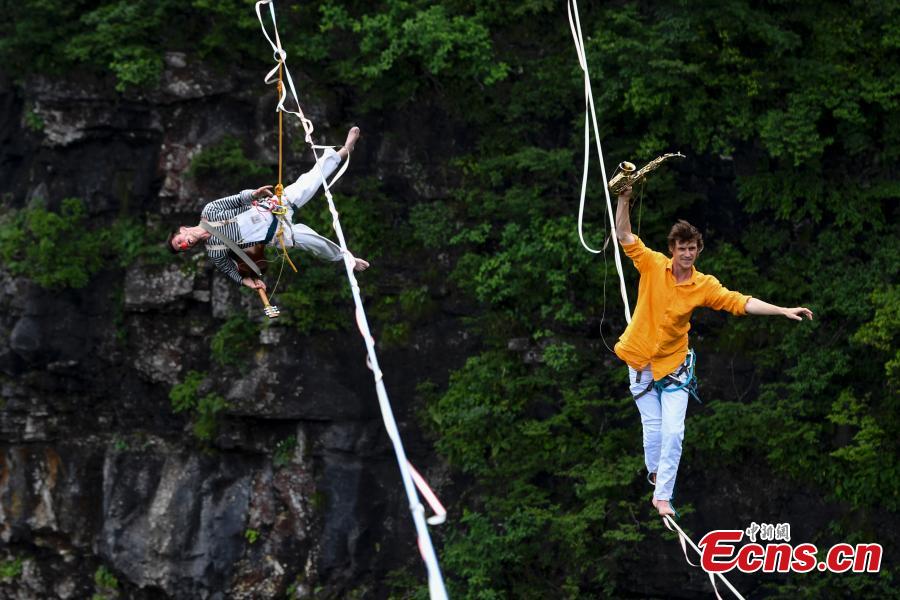Members of the band HouleDouse perform on slacklines across the 1,400-meter-high cliffs of Tianmen Mountain in Zhangjiajie National Forest Park in central China's Hunan province, on Wednesday, May 23, 2018. HouleDouse have made their Asian debut in China, in a show that combines extreme sports with music. (Photo: China News Service/ Yang Huafeng)