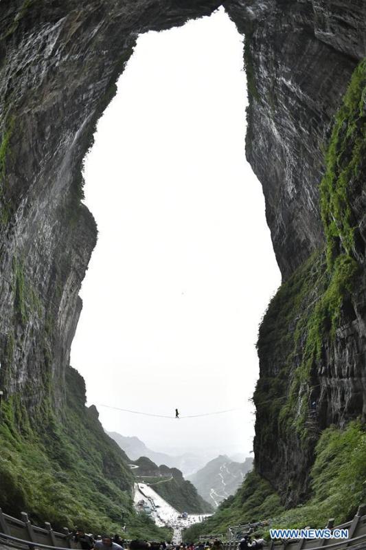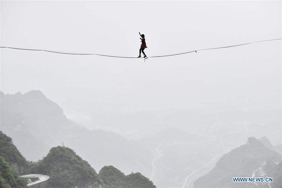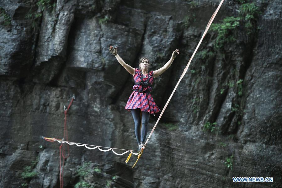 Mimi Guesdon of France participates in a slackline contest in high heels in Zhangjiajie, central China's Hunan Province, May 27, 2018. (Xinhua/Shao Ying)