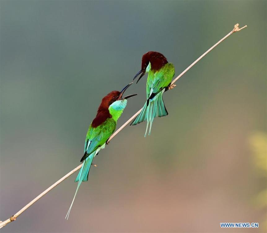 Blue-throated bee-eaters perch on a branch at Houlou Village, Yangzhong Town, Youxi County, southeast China's Fujian Province, May 25, 2018. (Xinhua/Mei Yongcun)