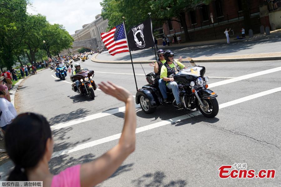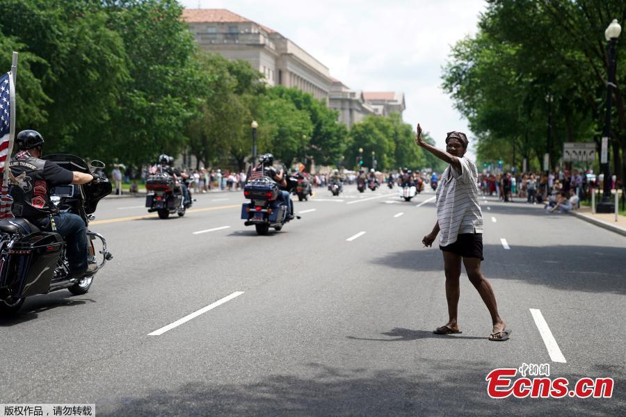 A woman waves at riders as thousands of military veterans and their supporters participate in the 31st annual Rolling Thunder motorcycle rally and Memorial Day weekend "Ride for Freedom" motorcycle procession in Washington, U.S., May 27, 2018. (Photo/Agencies)