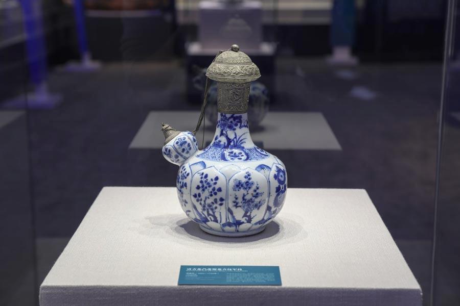 A blue-and-white porcelain water container of the Qing Dynasty is among the exhibits on show. (Photo provided to China Daily)