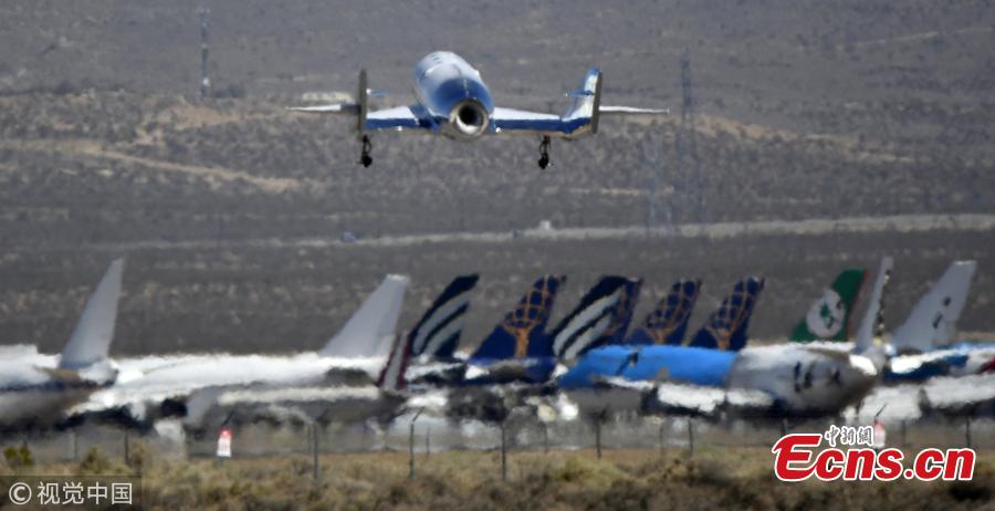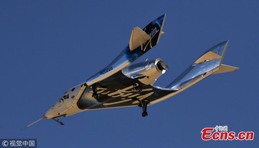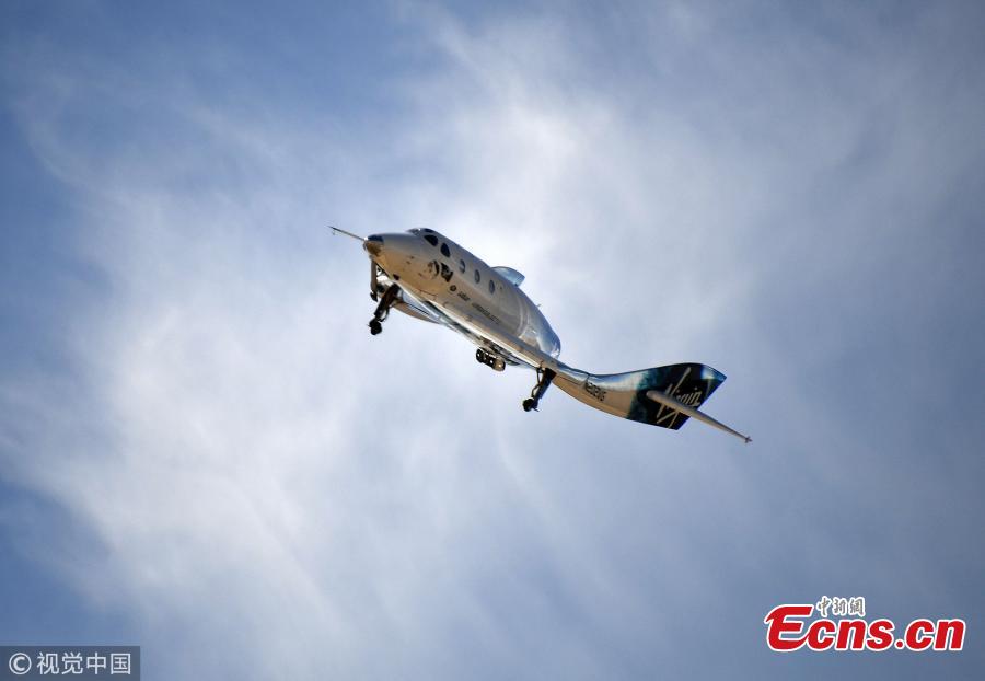 Virgin Galactic has conducted the second rocket-powered test flight of its tourism spaceship in the skies over Southern California. The company said VSS Unity fired its rocket motor for 31 seconds and climbed to an altitude of 114,500 feet (34899.6 meters) on Tuesday, May 29, 2018, then glided to a landing at Mojave Air and Space Port. (Photo/VCG)