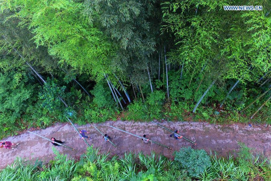 Villagers carry bamboo with wine in it at Daliu Village, Longji Town, Longsheng County, south China's Guangxi Zhuang Autonomous Region, May 30, 2018. Best known for its rich bamboo materials, Longji has developed bamboo wine industry in recent years. The bamboo wine, usually taking three or four months for brewing in growing bamboos, is popular here. (Xinhua/Huang Yongdan)