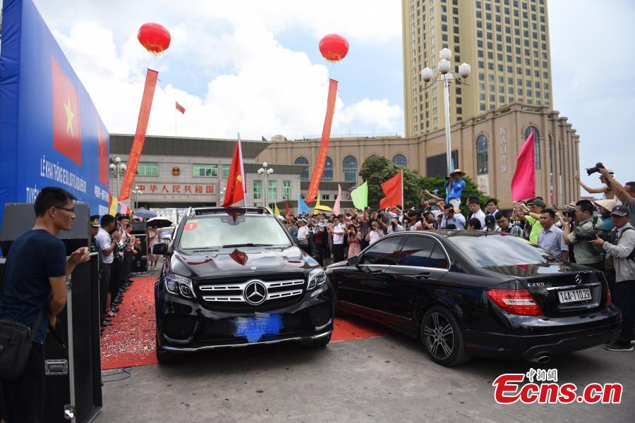 Photo taken on June 1, 2018 shows the launch ceremony for the Guilin-Ha Long City self-driving tourism route in Dongxing, South China’s Guangxi Zhuang Autonomous Region. Forty-eight cars from China and 18 cars from Vietnam join the five-day trip that will include the Chinese cities Fangchenggang, Qinzhou, Nanning, Laibin, Liuzhou and Guilin as well as the Vietnamese cities Mong Cai and Ha Long. (Photo: China News Service/Chen Yicai)