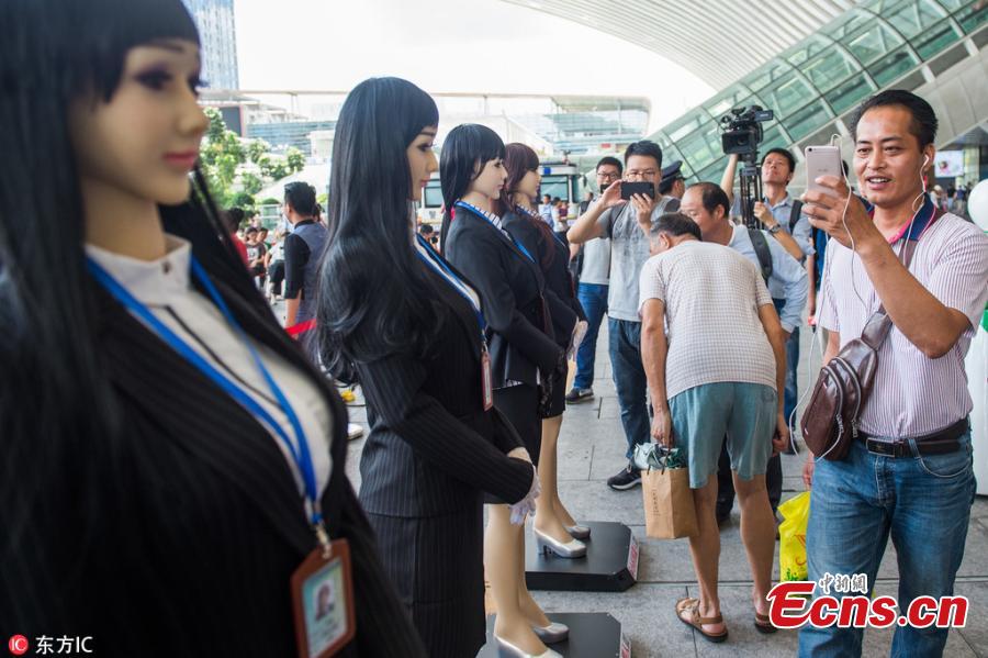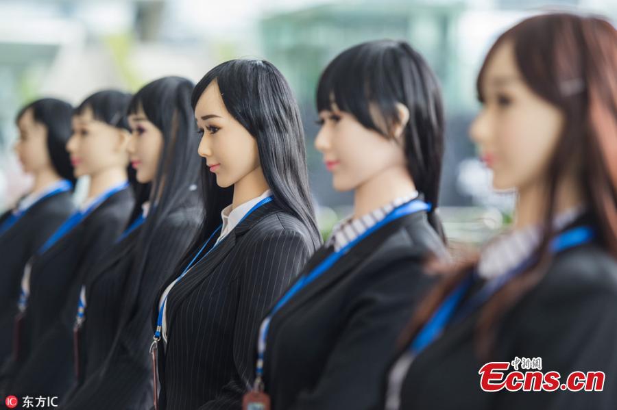 Humanoid robots are used to promote public awareness of drug abuse in an event to mark the International Day Against Drug Abuse and Illicit Trafficking at a railway station in Shenzhen City, South China's Guangdong Province, June 26, 2018. The six robots distributed brochures and interacted with visitors at the event, jointly organized by local police, an artificial intelligence association and a robot developer. (Photo/IC)