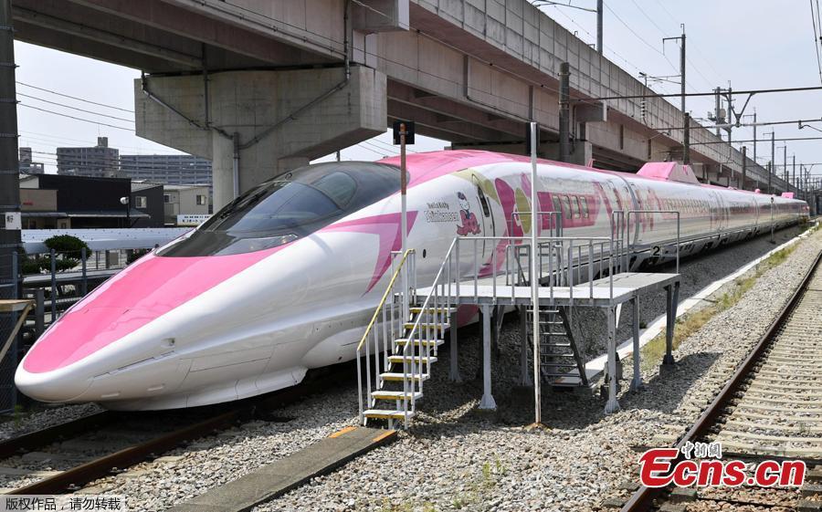 West Japan Railway Company unveils Hello Kitty Shinkansen, bullet train, at Hakata Railyard and Factory in Nakagawa-machi, Fukuoka Prefecture on June 25, 2018. It will travel between Shin-Osaka and Hakata station from June 30. Various kinds of Tourist Information will be offered at the first car and visitors can take picture with Kitty at the second.( Photo/Agencies)