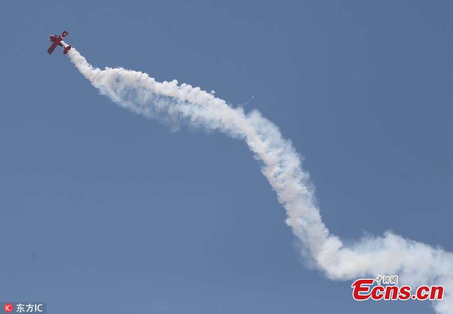 Semin Ozturk, Turkey's first professional female aerobatic pilot performs a demonstration flight with her 'Pitts S2-B' plane that has Lycoming engine with 360 horsepower, at Necati Artan Facilities of Sivrihisar General Aviation Center in Eskisehir, Turkey, April 22, 2018. A 27-year-old aerobatic pilot, Semin experienced her first aerobatic flight performing when she was 12 years old with her father Ali Ismet Ozturk who is also an aerobatic pilot. On Sept. 19, 2015, she realized her first airshow at Sivrihisar General Aviation Center. Ozturk will attend the Aeromania Airshow which will take place between July 14-15 and host 35 aerobatic pilots from many countries. (Photo/IC)