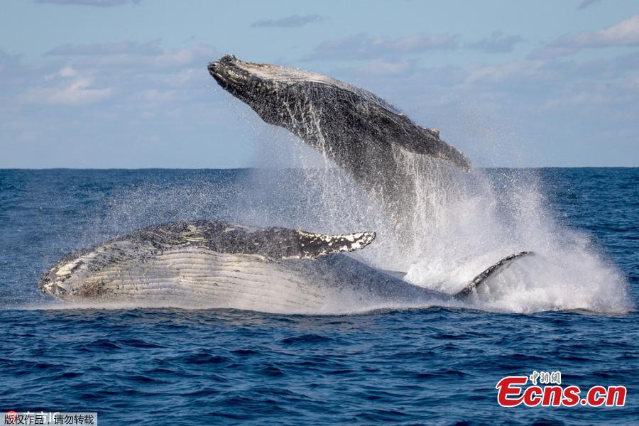 Wildlife photographer John Goodridge has captured the breathtaking moment two mammoth 40-tonne humpback whales leapt out of the water in an incredible display of "extremely rare" double breaching. John Goodridge, 54, was thrilled after witnessing the two "majestic" 14-meter long marine mammals "showing off" less than 100 meters from his cruise boat sailing out of Sydney Heads, New South Wales, Australia. (Photo/IC)