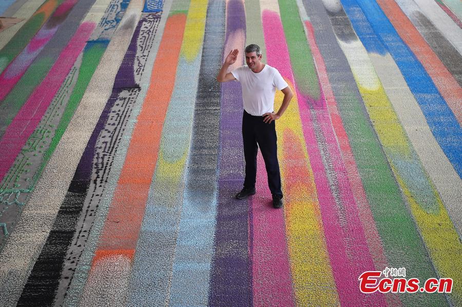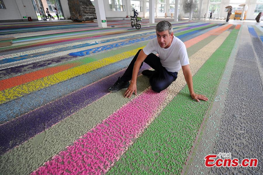 Swiss visual artist Raphael Hefti poses with his creation during an international sculpture festival in Pingyao County, North China’s Shanxi Province. More than 40 artists brought their sculpture works to the festival in the ancient town.(Photo: China News Service/Wei Liang)