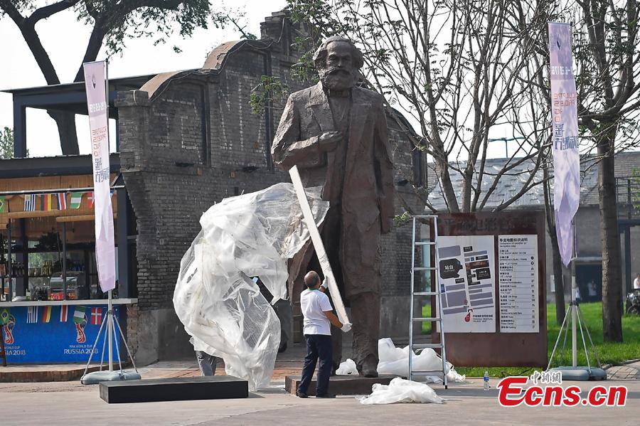 A sculpture of Karl Marx by artist Wu Weishan is prepared for an international sculpture festival in Pingyao County, North China’s Shanxi Province. More than 40 artists brought their sculpture works to the festival in the ancient town.(Photo: China News Service/Wei Liang)