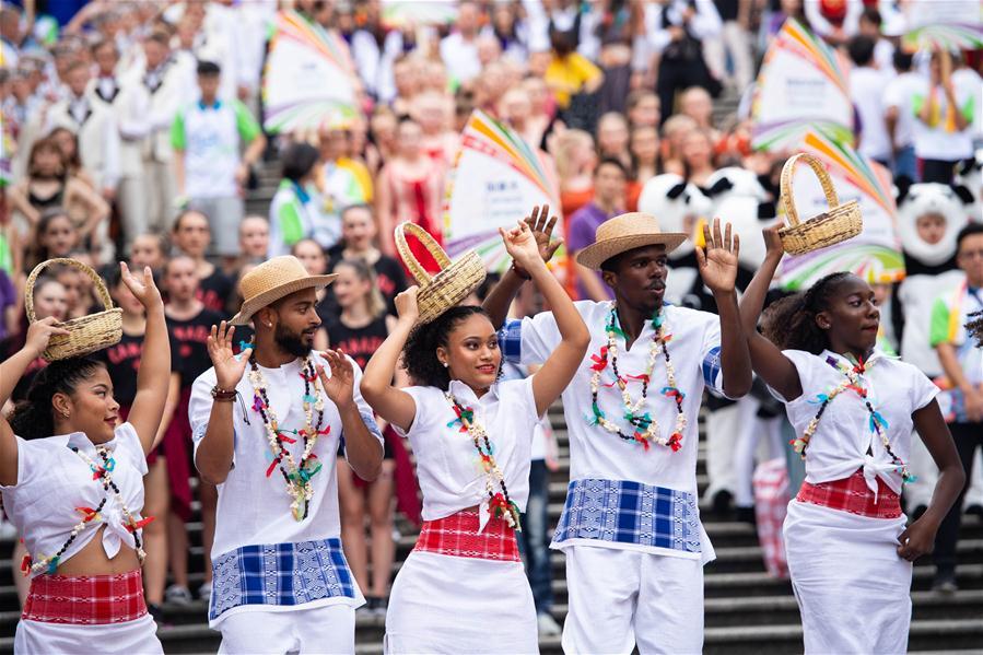 Dancers perform during a parade of an international youth dance festival in Macao, south China, July 21, 2018. A total of 27 dance teams participated in the event here on Saturday. (Xinhua/Cheong Kam Ka)