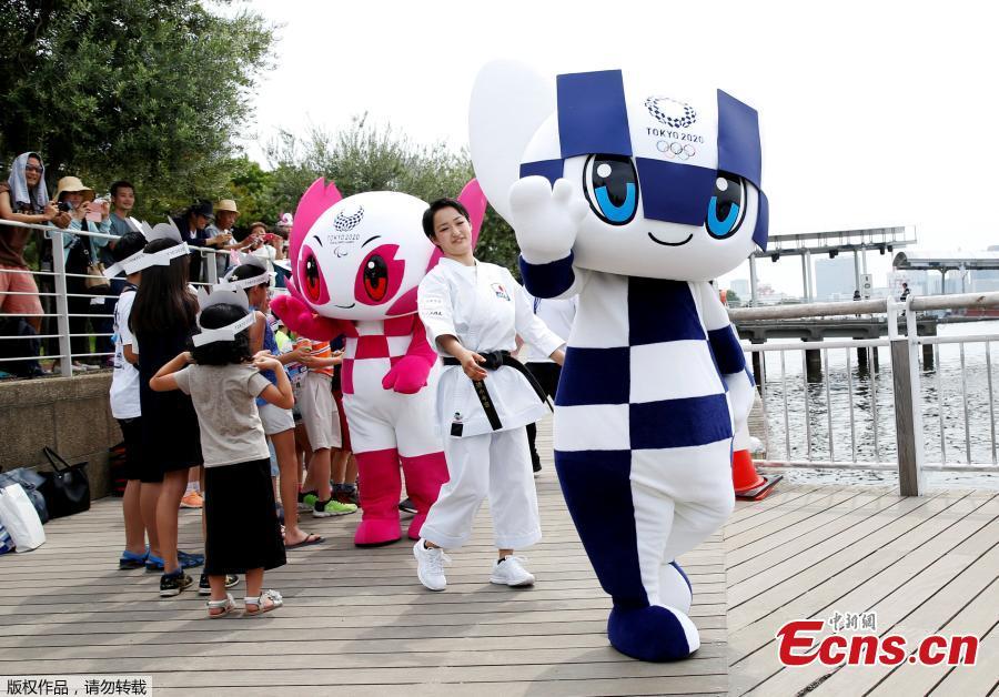 Tokyo 2020 Olympic Games mascot Miraitowa and Paralympic mascot Someity, flanked by Japan's karateka Kiyo Shimkizu are greeted by children upon their arrival after their water parade at Odaiba Marine Park in Tokyo, Japan July 22, 2018. (Photo/Agencies)