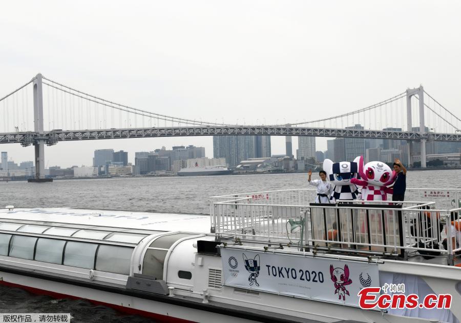 Tokyo 2020 Olympics Games mascots, Miraitowa and Someity ride on a boat during their debut event of water parade in front the Rainbow bridge with karate player Kiyo Shimizu and para-athlete Hajimu Ashida in Tokyo, Japan July 22, 2018. (Photo/Agencies)