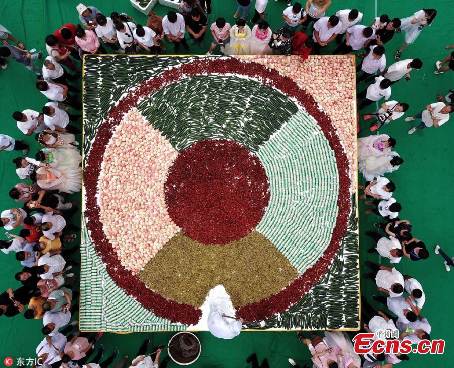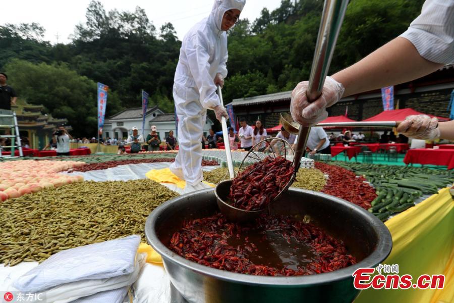 A crayfish banquet is held on Laojun Mountain in Luoyang City, Central China’s Henan Province, July 28, 2018. Organizers prepared more than 1,000 kilograms of crayfish and another 1,000 kilograms of fruit, as well as providing beer, to entertain thousands of visitors, who quickly gobbled up the treats. (Photo/IC)