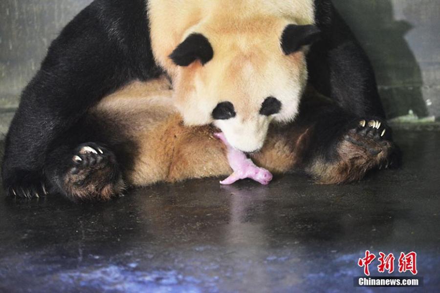 Giant panda Cao Cao holds her cub at the Hetaoping base of the China Conservation and Research Center for the Giant Panda in Sichuan Province. Cao Cao gave birth to twins of mixed sex, with the male weighing 215 grams and the female 84 grams, on July 25. The mother panda is looking after the male cub herself, while the female one is now under the care of keepers. Cao Cao is the first captive panda to give birth to twins after mating with a wild panda. (Photo: China News Service/Li Chuanyou)
