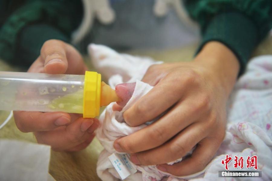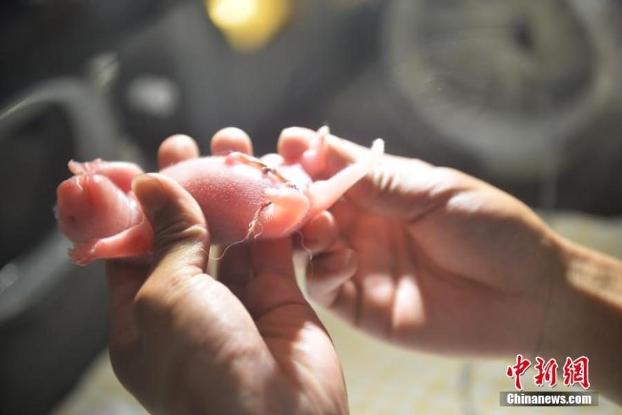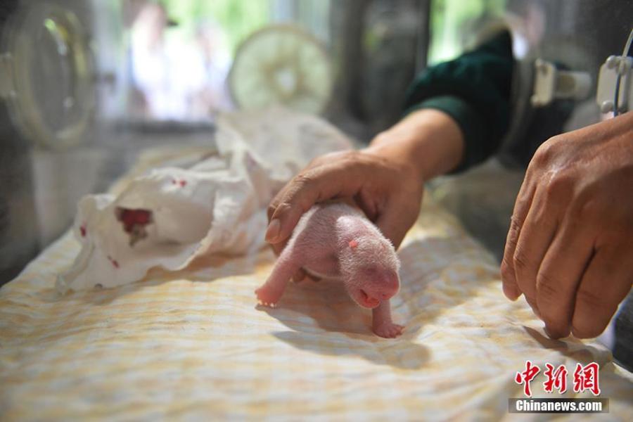 A keeper takes care of a new panda cub at the Hetaoping base of the China Conservation and Research Center for the Giant Panda in Sichuan Province. Cao Cao gave birth to twins of mixed sex, with the male weighing 215 grams and the female 84 grams, on July 25. The mother panda is looking after the male cub herself, while the female one is now under the care of keepers. Cao Cao is the first captive panda to give birth to twins after mating with a wild panda. (Photo: China News Service/Li Chuanyou)
