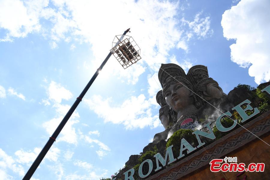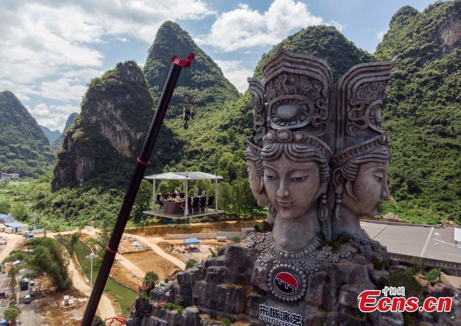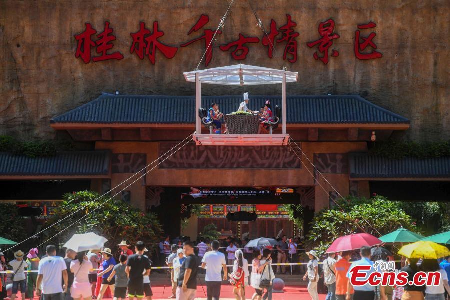 Participants face the challenge of eating rice noodles in a transparent room, hoisted 50 meters off the ground, near a giant statue at a scenic spot in Guilin City, South China’s Guangxi Zhuang Autonomous Region, July 29, 2018. Scared of the height, the participants gave up on the dare when the room was just ten meters off the ground. (Photo: China News Service/Chen Chen)