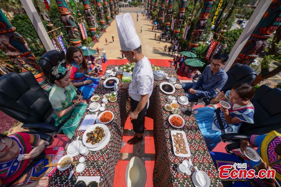 A Ukrainian woman takes a rice noodle-eating challenge in a transparent room, hoisted 50 meters off the ground, near a giant statue at a scenic spot in Guilin City, South China’s Guangxi Zhuang Autonomous Region, July 29, 2018. Scared of the height, the participants gave up on the dare when the room was just ten meters off the ground. (Photo: China News Service/Chen Chen)