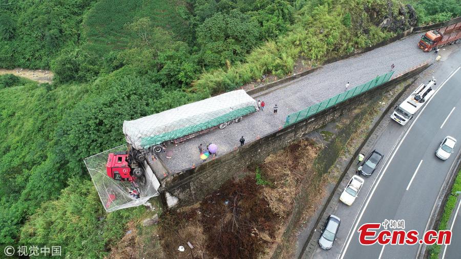 A cargo truck’s cabin hangs on a slip road in Yuxi City, Southwest China’s Yunnan Province, July 26, 2018. Having lost control of the truck on a 27-kilometer-long downward slope, known as the "death road" on the G8511 Expressway, the driver steered the truck towards a slip road, finally bringing the vehicle to a stop after crashing it into a barricade. The truck’s cabin hung from the cliff road and its two drivers were thrown out, but they fell safely onto a huge net, built by local police in 2015 to catch people after similar car accidents in the past. The net, checked and updated regularly, has saved the lives of at least five people, local police said. (Photo/VCG)