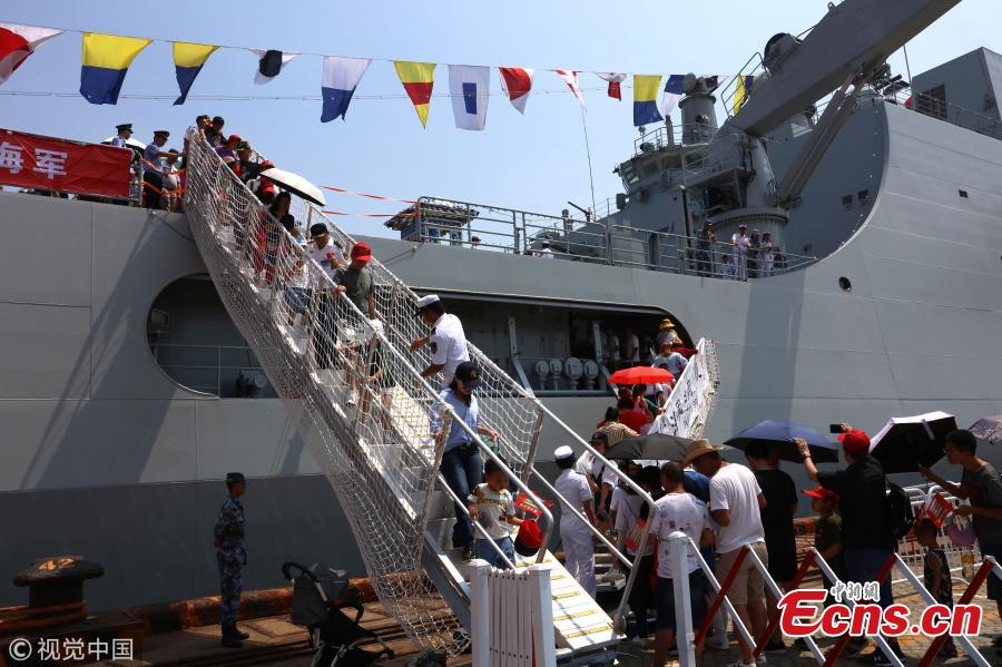 People visit the missile destroyer Changchun of the PLA Navy in Quanzhou, Fujian Province, July 30, 2018, as the "Seaborne Assault" contest, part of the International Army Games 2018, is held there. The PLA Navy has opened four warships to the public over a three- day period, and they had already attracted thousands of visitors. (Photo/VCG)