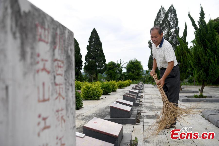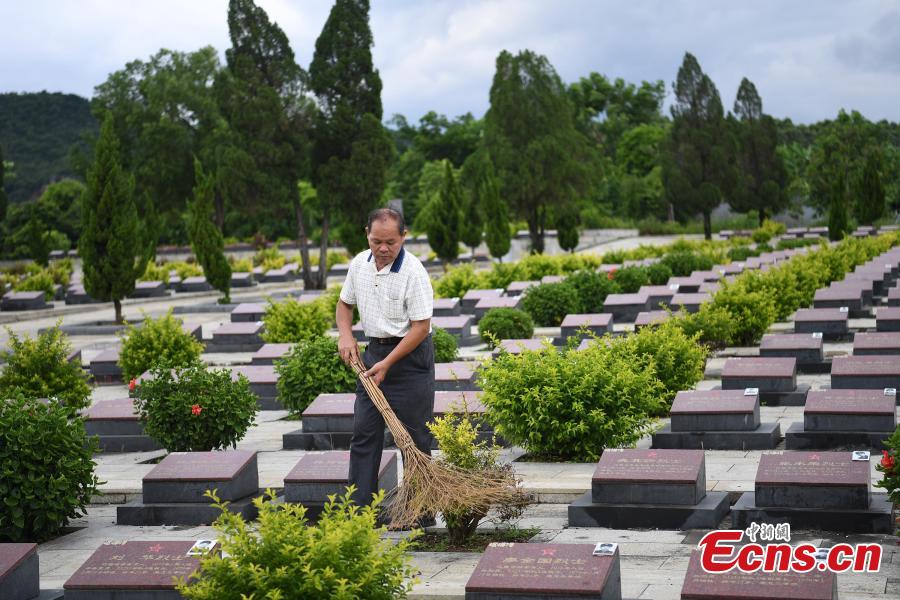 Niu Bentong, 62, works at a martyrs cemetery in Longzhou County, South China’s Guangxi Zhuang Autonomous Region, July 30, 2018. Niu participated in the China-Vietnam war and witnessed the death of many of his comrades-in-arms in front of him. In 1980, Niu chose to work in the cemetery, where 1,902 martyrs lie, and he continued to work there for 37 years until his retirement this year. He has helped correct information related to more than 400 martyrs and has also shared details online. In his spare time, Niu continues to help at the cemetery, saying it’s hard to forget the days of life and death spent alongside his fellow soldiers. (Photo: China News Service/Yu Jing)