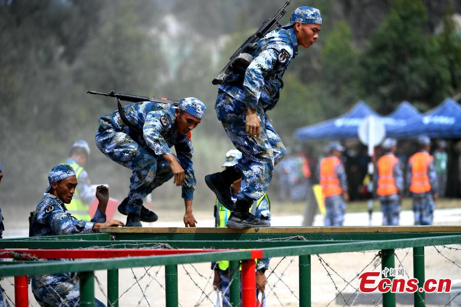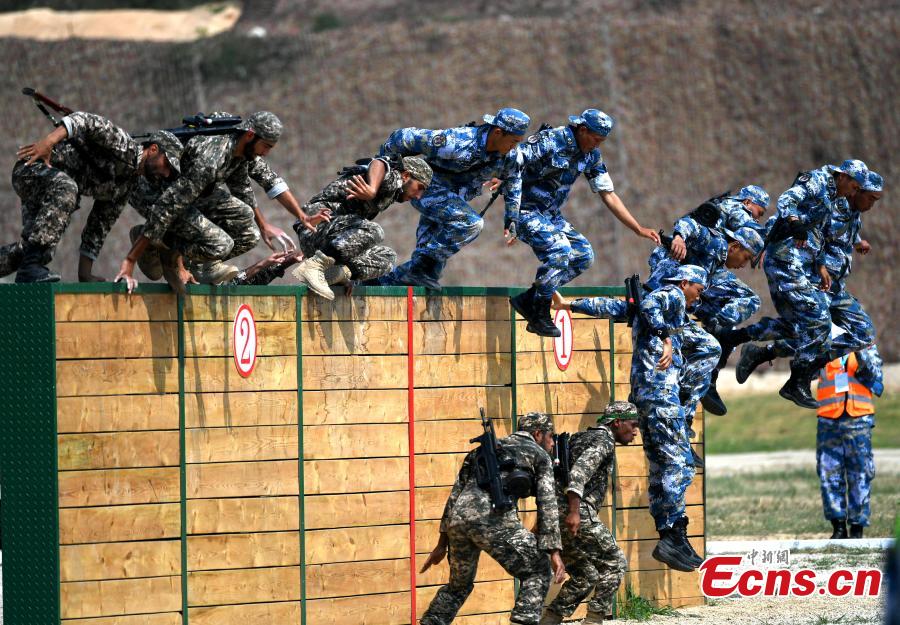Venezuelan and Sudanese soldiers participate in the "Seaborne Assault" contest, part of the International Army Games 2018, held in Quanzhou City, East China’s Fujian Province, July 30, 2018. Contestants from Iran, Russia, Sudan, Venezuela and China competed in the contest, which consisted of an obstacle course, a survival trail and a relay race. Among 13 teams, Chinese marine forces took the top three spots in the obstacle course. (Photo: China News Service/Wang Dongming)