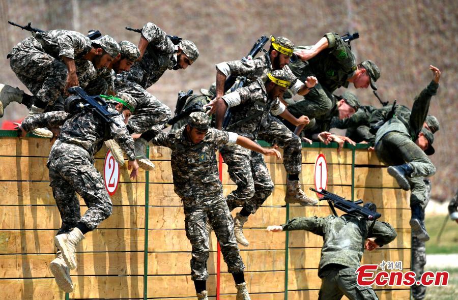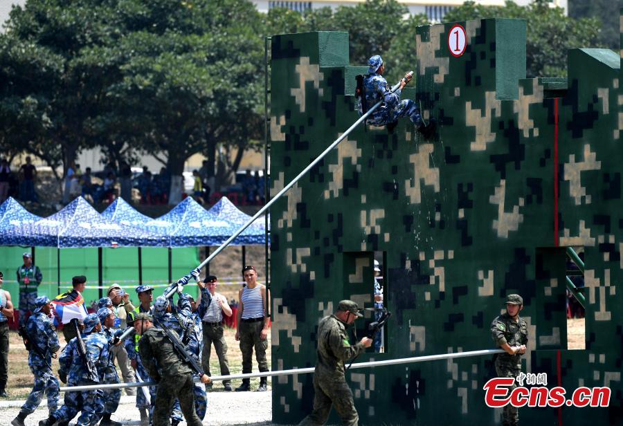 Iranian and Russian soldiers participate in the "Seaborne Assault" contest, part of the International Army Games 2018, held in Quanzhou City, East China’s Fujian Province, July 30, 2018. Contestants from Iran, Russia, Sudan, Venezuela and China competed in the contest, which consisted of an obstacle course, a survival trail and a relay race. Among 13 teams, Chinese marine forces took the top three spots in the obstacle course. (Photo: China News Service/Wang Dongming)